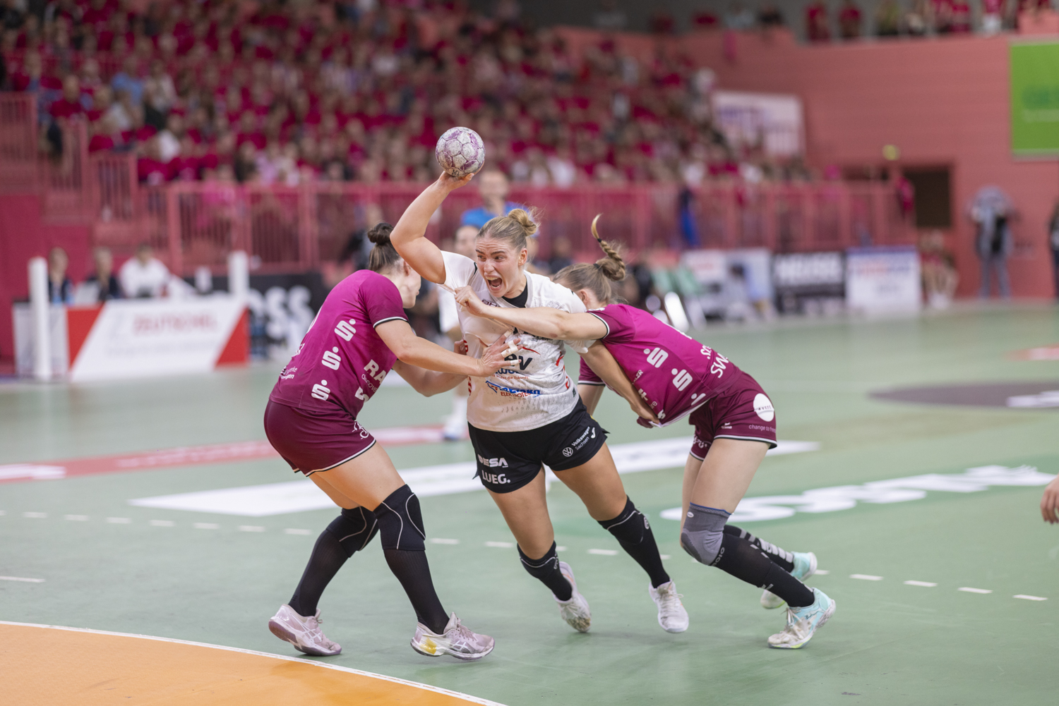 Mit Wiederbeginn trug sich Silje Bröns Petersen, einstmals für die Tussies am Ball, erstmals in die Torschützenliste ein. Der BSV setzte seine Taktik mit empty goal und zwei Kreisläuferinnen, neben Hasselbusch mit Laura Szabo, fort. Hasselbusch, die an diesem Abend auf drei Tore kam, agierte im Abschluss wiederholt unglücklich und wurde in der 42. Minute nach ihrer dritten Zweiminutenstrafe durch die unauffällig und gut agierenden Schiedsrichter Kijowsky und Strüder mit „rot“ vom weiteren Spielgeschehen ausgeschlossen. Bis Minute 44 zog Metzingen in Überzahl auf 29:23 davon. Wenig später entschärfte Suba einen Siebenmeter von Penzes. In der folgenden Auszeit versuchte Rentsch, seiner Mannschaft einige taktische Varianten an die Hand zu geben und beorderte Thara Sieg ins Gehäuse. Nur drei Minuten später zog er seine letzte Auszeit-Möglichkeit, um sein Team auf die „Crunch Time“, also die entscheidenden Minuten, einzustimmen. Penzes war zwar wieder mit Strafwurf erfolgreich, doch in den torreichen letzten Minuten bekam die wieder ins Tor gerückte Györi einfach keine Hand mehr an den Ball. So setzte sich der DHB-Pokalsieger von 2024 am Ende mit 41:34 durch. Die nach dem Match als MVP, wertvollste Spielerin, geehrte Naina Klein stufte den Sieg als „sauwichtig“ ein und meinte man müsse jetzt dort weitermachen und immer 60 Minuten Gas geben. Die Unterstützung der Fans hob sie auch hervor, die beflügelt habe.